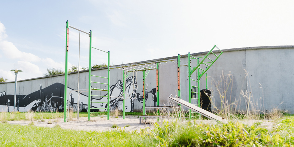 På Egely har vi motionsrum, udendørs træningsredskaber og en hal, græsareal og boldbaner med plads til fx volleyball, basketball og fodbold.